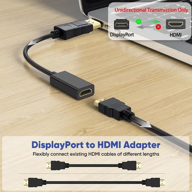 (Note: Supports unidirectional transmission only from DP port to HDMI port) ^^ Solve Connection FrustrationPlug and Play. The DP male interface of this adapter can easily cope with the problem of insufficient HDMI ports in the source device, and its HDMI female port can be flexibly used with existing male to male HDMI cables, effectively reducing device upgrade and usage costs ^^ Wide CompatibilityThe DisplayPort to HDMI adapter perfectly connects desktop computer, laptops, graphics cards (AMD, NVIDIA) equipped with a DisplayPort interface to monitors, projectors, or HDTV, etc featuring an HDMI port. Its compact and portable design also allows you to handle situations like mobile office work and temporary presentations with ease ^^ Top-Notch QualityThe built-in advanced IC chip converts DisplayPort signals to HDMI signals, significantly enhancing information processing efficiency. 24K gold-plated connector (with latch) and refined copper core ensure precise and stable signal transmission for this display to hdmi adapter ^^