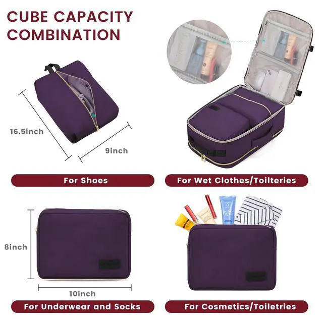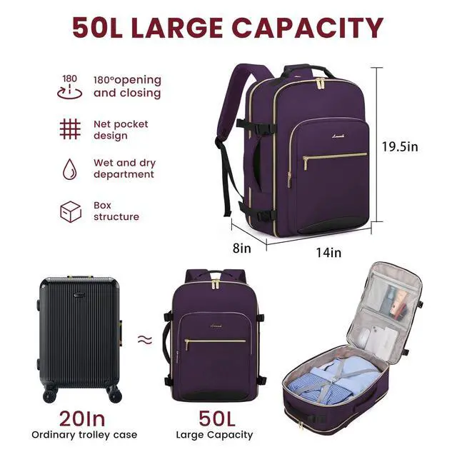 50L LARGE CAPACITYOur travel backpacks enable you to pack all your travel essentials for a 7-9 day travel, which can hold 3-7 days' clothing, a pair of shoes, your wallets, toiletries, a 17.3 '' laptop, a 12.9 '' iPad and so on. The side straps can also help you compress the pack when it is too full. ^^ WELL-DESIGNED COMPARTMENTSThis travel backpack has 4 main compartments and 3 packing cubes supplied, which enable you to keep your things in order. Your shoes, toiletries, and underwear can be placed in separate packing cubes.