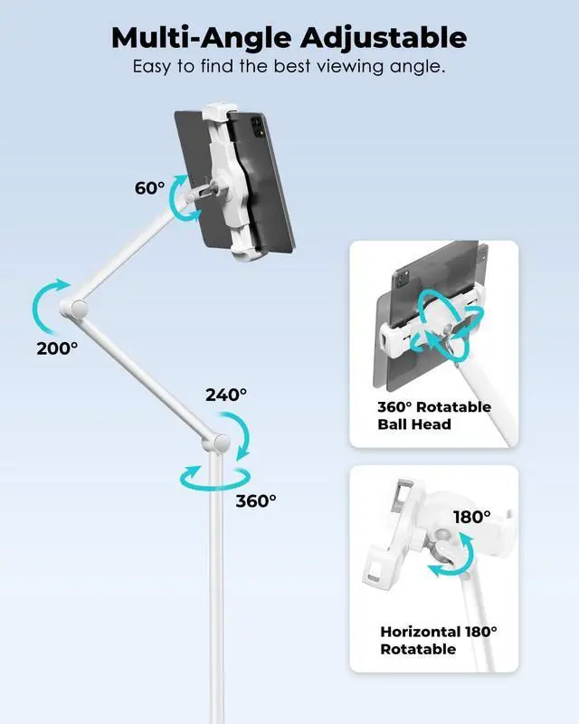 Multi-Functional Tablet StandThis is a stand designed specifically for floor use. You can easily place the stand beside the bed or sofa, watch TV programs, and engage in video calls with family. Additionally, you can use it in your office, living room, kitchen, bedroom, etc. ^^ Universal CompatibilityThis ergonomic tablet/phone holder, compatible with all 4.7 - 13 inch cell Phones and tablets, Compatible with iPhone X 11 12 13 14 15 16/ Pro/ Pro max/ Mini/, iPad Air 2 3 4, Samsung, iPad mini/pro 11 inch, Galaxy etc.