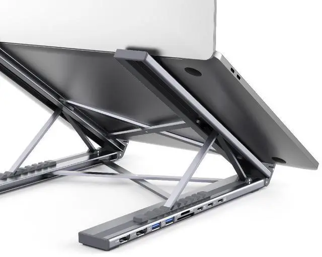 Versatile USB-C Hub & Stand IntegrationRevolutionize your workspace with this multifunctional USB-C hub stand. Featuring dual 4K@60Hz HDMI output, dual USB 3.0 ports for 5Gbps data transfer, a USB-C PD 3.0 port supporting up to 100W power delivery, and SD/TF card slots for seamless data access. It's a comprehensive solution for connecting and powering all your peripherals with ease.