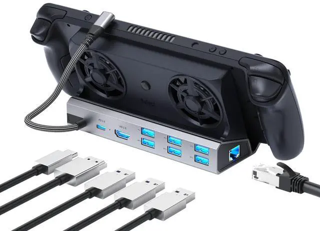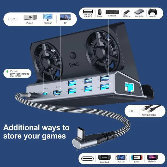 Handheld Console Dock: Transforms your Steam Deck OLED/ASUS ROG ALLY/Legion Go's USB Type-C into 9 ports: HDMI 2.0 (4K@60Hz), Gigabit Ethernet (1000Mbps), 1 USB 3.0 (5Gbps), 3 USB 2.0, SD/TF, USB Type C PD 3.0 (100W), 1 Key to change Screen, this handheld console dock combines hub, stand base, heat sink, 40Gbps Type C adapter, 4 Cpas, 1 HDMI cord in 1.5M, it is a professional handheld gaming dock station. ^^ 3 speed Adjustable Cooling Fans Designhis brand-new docking station can meet the needs of most gamers. You can adjust the fan speed to three different gears. Colorful LED atmosphere lights are built into both the fans and the bottom of the docking station, which can enhance your gaming experience. ^^ Stable Gigabit Ethernet & Fast