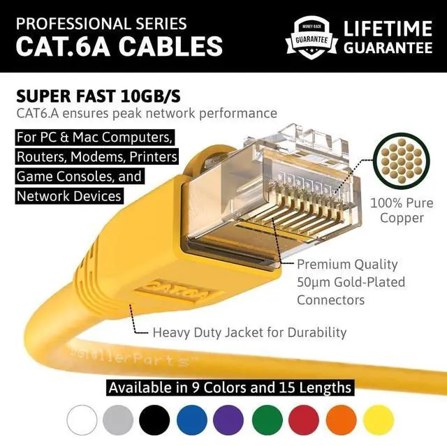 InstallerParts Cat6A Network Patch Cables offer connectivity to computers and network components such as routers, switch boxes, network printers, network attached storage (NAS) devices, VoIP phones and more. InstallerParts Booted Cat6A patch cables are available in 15 different lengths ranging from 0.5 foot to 200 feet and in a variety of colors (black, blue, gray, green, orange, purple, red, white and yellow). This cable provides exceptional transmission performance and low signal losses. It supports up to 550 MHz and is suitable for fast ethernet, gigabit ethernet, and 10-gigabit ethernet.