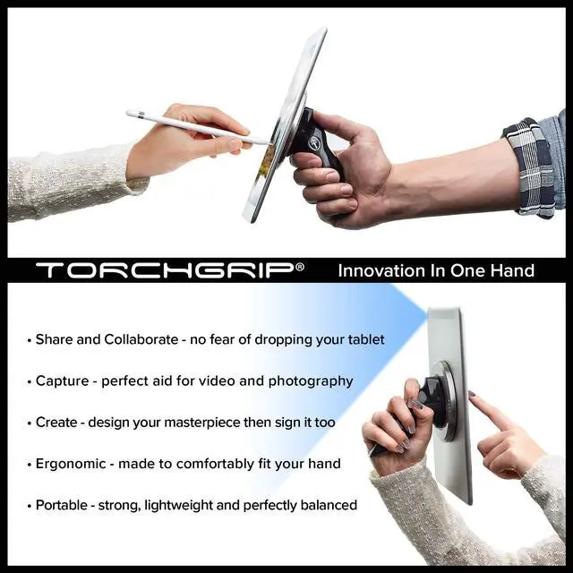 IT'S A GRIP: TORCHGRIP's design gives you incredible ergonomic control of your tablet when you are on the move. The grip was carefully designed to fit the human hand while providing you confidence to securely hold your tablet. This is because the grip is contoured and angled to allow your hand to naturally "lock" around it. Finally, the lightweight design adds only 2.6 ounces to the total weight of your tablet device removing another user complaint with cases being heavy, bulky and unpleasing to the eye.