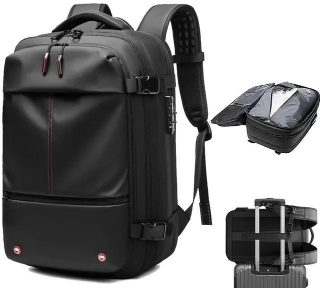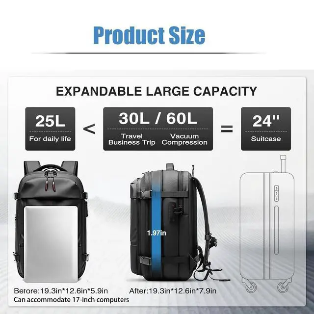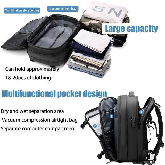 Space Saving This vac pack backpack features an integrated vacuum compression system, which can save a lot of space to store more items. When fully expanded, the backpack achieves an impressive 60L capacity, comparable to a 24-inch suitcase. ^^ Anti-theft Lock Design Equipped with a main compartment combination lock to ensure the safety of your belongings during travel, allowing you to travel with peace of mind and protect your valuables from theft. ^^ Multiple Compartments and PocketsDesigned for versatility, the vacuum backpack includes multiple compartments such as a wet/dry separation layer, water bottle pocket, anti-theft pocket, padded compartments for 17" laptops, a multi-functional organizer, and the integrated vacuum bag.