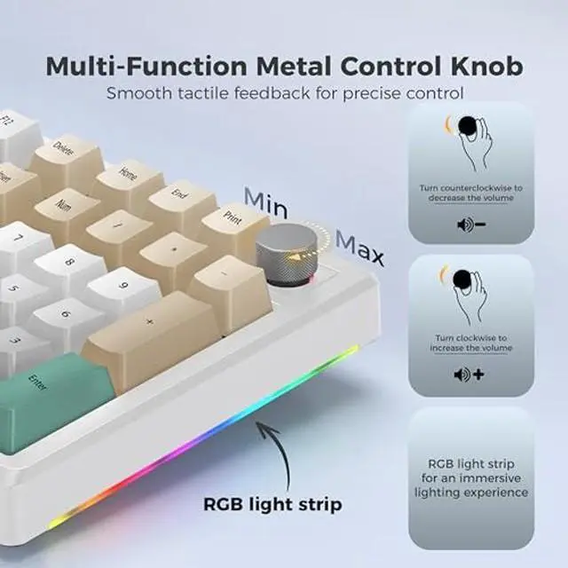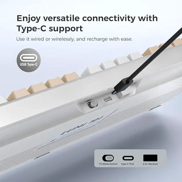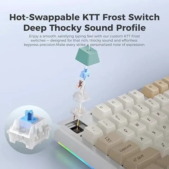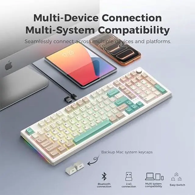 Multi-device connectivity: The LUMI101 supports three connection modes: Bluetooth 5.0, 2.4GH z wireless (via the included receiver), and USB-C wired connection. By using the FN combination keys, you can easily switch between 5 paired devices (laptops, desktops, tablets, smartphones, game consoles) with ease (no need for repeated pairing, 1-second switch), enabling efficient multitasking. Whether for work, gaming or studying, the LUMI101 can make your device configuration flexible and unrestricted, with no interruptions and seamless usage in all scenarios. The LUMI101 adopts a hot-swappable PCB design, compatible with 3-pin and 5-pin mechanical keycaps - you can easily replace them without soldering. It comes with a key/column extraction tool to help you freely replace the keycaps and key columns, creating an ideal feel. Factory-pre-installed linear keycaps ensure smooth touch and quick response. The full-size keyboard with a numeric keypad offers a clean and efficient tapping sound for both gaming and professional work. It is suitable for long gaming sessions and professional office use. Achieving a perfect balance between mechanical accuracy and silent performance, it is highly suitable for shared office environments and home use. LUMI101 is a high-end TKL mechanical keyboard that combines gaming and productivity features.