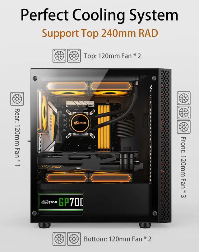 Air Cooling Optimized with 8-Fan Support: Engineered for Maximum Airflow. Designed around an efficient open-air layout, this chassis supports up to eight 120mm fans. This strategic placement allows you to create powerful, directed airflow to keep your CPU and GPU running cool under heavy loads, establishing it as a perfect foundation for any air-cooled bu