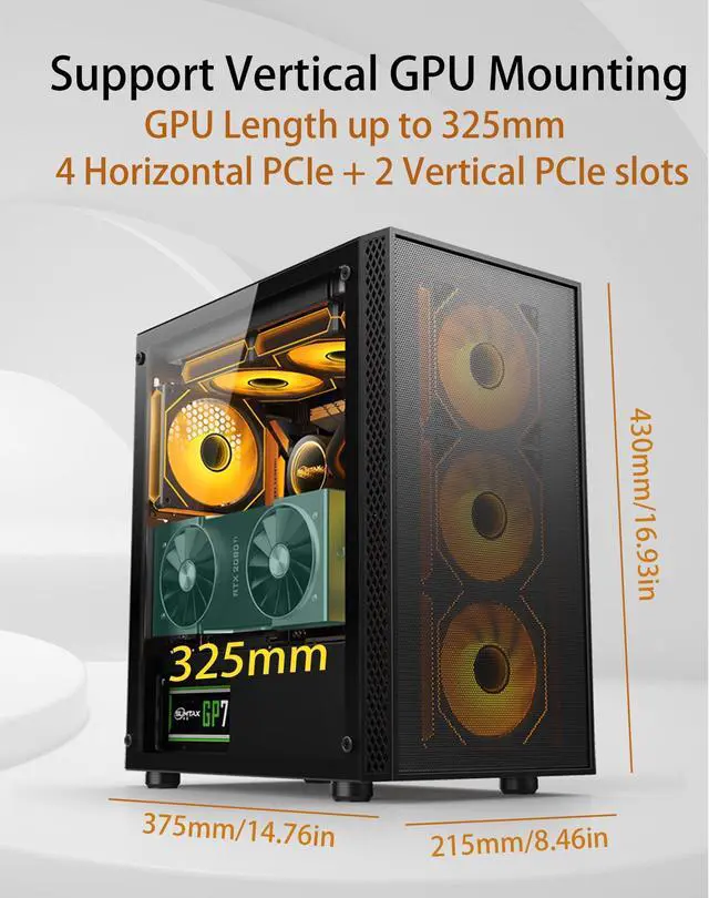 Wide-Body Compatibility & Vertical GPU Ready: The wide-body design delivers excellent compatibility, supporting graphics cards up to 320mm long and CPU air coolers up to 165mm tall. It's also ready for vertical GPU mounting (riser cable