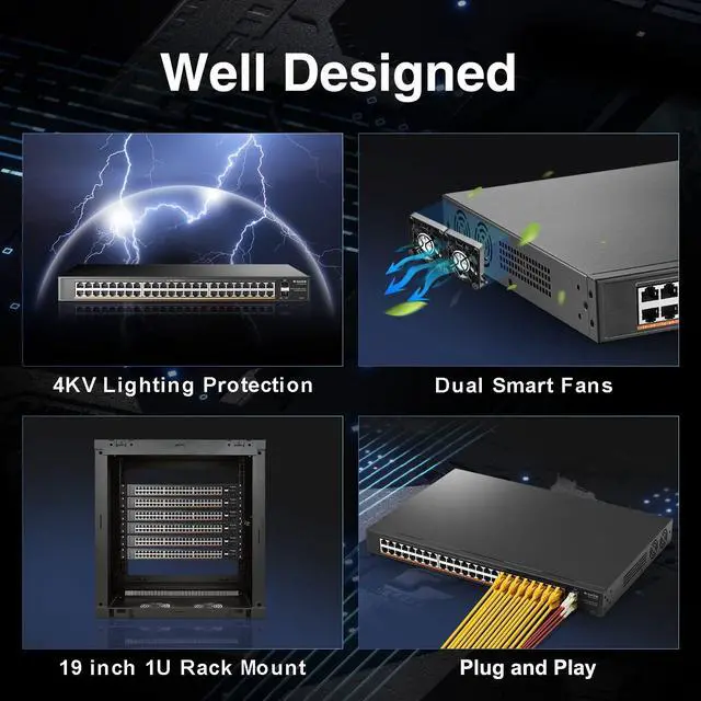Gigabit Ports: 48 Gigabit POE+ ports, 2 Gigabit SFP UpLink, can be more flexible and long distance to connect to different network devices, such as routers, switches, servers, etc.