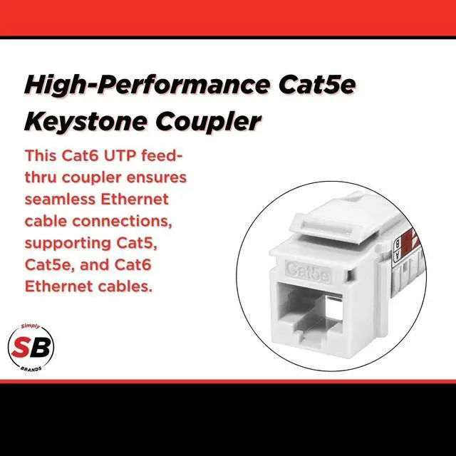 Reliable Network Connectivity - Supports Ethernet cables including Cat5e, and Cat5, ideal for patch panels, wall plates, and surface mount boxes. ^^ Easy IDC Termination - Designed for quick installations, this RJ45 keystone jack ensures strong signal integrity in Ethernet coupler setups. ^^ Certified High Performance - This Ethernet connector is UL-certified, ensuring stable data transmission for Ethercon cable and RJ45 coupler applications ^^ Versatile Cable Compatibility - Designed for structured cabling, this keystone jack supports Cat5e Ethernet cables and Cat 5 connectors for efficient networking. ^^ Effortless Cable Management - The compact design allows side-by-side installation in patch panels, making it ideal for RJ45 adapters and Ethernet extenders.