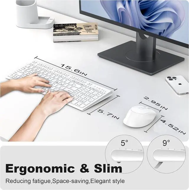 Perfect for shared spaces like libraries or open offices. ^^ Space-Saving Full-Size Layout with Dedicated Multimedia Keys The compact design with a numeric keypad saves 10% of desktop space while retaining the functionality of a full keyboard. The independent F1-F12 and multimedia keys eliminate the hassle of FN key combinations. Windows system mouse side button forward and back functions, boosting your workflow efficiency. ^^ Ergonomic Design for All-Day Comfort and Ease The keyboard includes adjustable feet for a custom typing angle, and the large mouse supports your wrist comfortably. Featuring low-profile scissor-switch keys and concave keycaps, the effortless, light-click design delivers a fast-response and consistently comfortable typing experience.