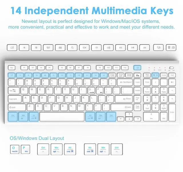 ^^ Advanced Wireless Tech with 33ft Range for Uncluttered Freedom Equipped with the latest wireless chip for a stable connection up to 33 feet (10m). Plug and play; simply connect with a USB receiver (Type-C port devices can be converted to USBC via the included adapter). Say goodbye to cable clutter and choose cordless long-distance connectivity. The Alt/Cmd dual-print layout is perfectly compatible with Mac, iMac, Macbook, and Windows systems.