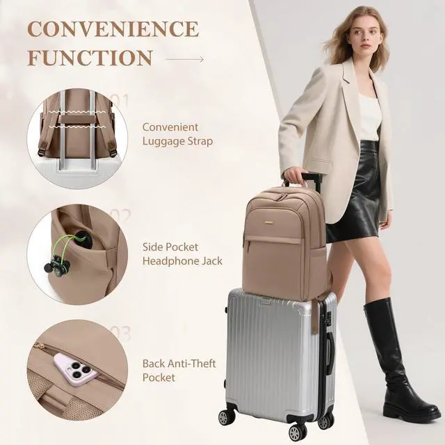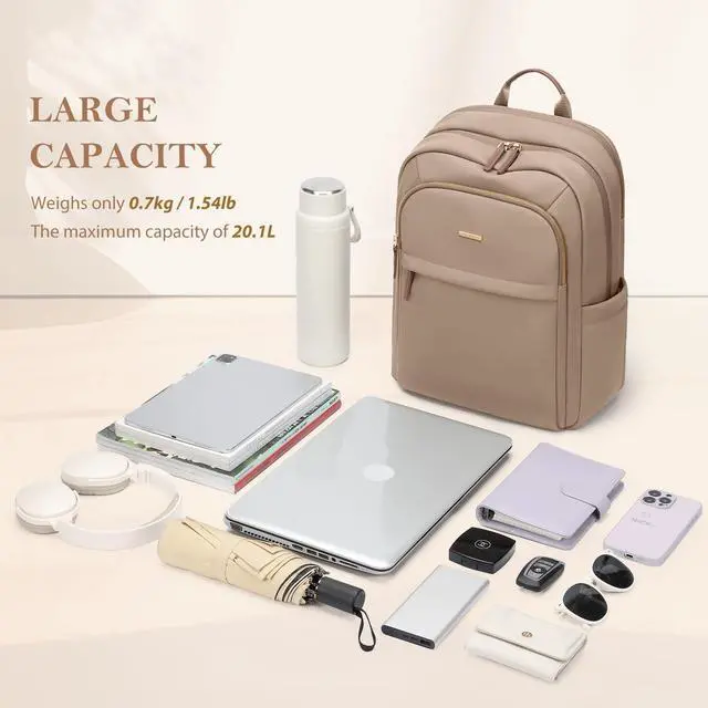Backpack Dimension 29.5 *44* 15.5CM / 11.61 * 17.32 * 6.1 inch ^^ MultifunctionThis travel backpack has a multi-layered design and has been optimized and upgraded to add more internal layers than other backpacks. The appearance also adds a headphone bag, which can easily carry a plugged earphone. Separate laptop compartments provide secure storage for your devices. The main compartment includes a zipper opening and two open pockets for easy storage. In addition, there is a front zipper pocket, two side pockets, and a luggage strap in the back. ^^ Upgraded FabricDurable and waterproof, this womens backpack is made of splash-proof Oxford fabric and premium superfiber synthetic leather, this travel backpack ensures that your items stay dry and prevents any leaks or moisture from affecting your other items.