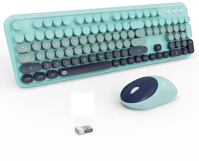 ATTENTION: wireless mouse and keyboard share one 2.4G hz USB receiver, it stored at the buttom of the mouse, plug and play. ^^ Full-Size keyboard with Ergonomic DesignThe typewriter keyboard wireless has colorful retro round keys and the silent click of the quiet mice will allow you to do your job without disturbing others. All circle buttons can be disassembled, put in water to clean. The typing key board is designed with a tilt angle, comfortable typing position. The cordless mouse is with modern ergonomic design,
