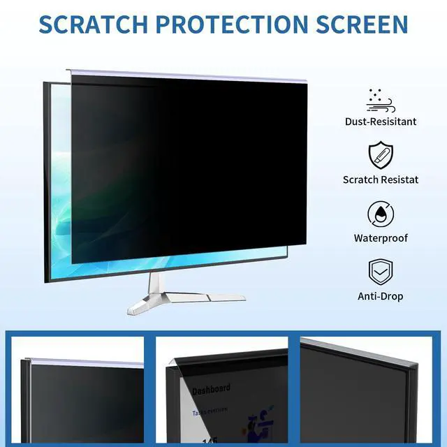 Width: 27.6 '' (702 mm), Height: 15.6 '' (397 mm), Diagonal: 32" ( 812.8 mm). Please verify your computer screen's width and height measurements before ordering. It's not recommended to make your selection based solely on your computer screen's diagonal size. ^^ Enhance Privacy Security After hanging the anti-blue light computer privacy screen filter, the screen has a visible area of 60 on the front, which makes the front of the screen clear. From both sides of the computer (30-60 angle), it will appear very dark and the screen content cannot be seen. Someone who tries to peek over the side will only see a dark screen! It greatly reduces the risk of prying eyes on personal privacy, stealing or malicious access to your important information! ^^ Eyes Protector Our computer screen privacy shield uses a unique upgraded version of Nano 75 material, which can filter out 98% of harmful blue light (400nm-480nm) for you, maximizing the protection of your eyes. ^^ Perfect for Open Workspaces The 32 inch computer privacy screen is perfect for public and high traffic areas. our monitor privacy screen is engineered to be compatible with HP, Dell, Samsung, Lenovo, LG, Acer, ASUS, ViewSonic and other monitor brands.