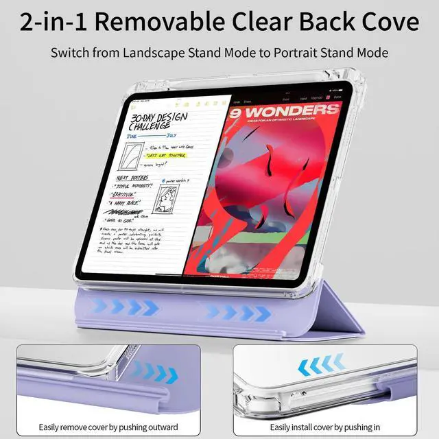 2-in-1 detachable sliding stand design: The case with detachable tri-fold sliding stand and transparent detachable back shell that can be placed vertically or horizontally, easily adjusting to multiple angles to meet your viewing and typing angle needs