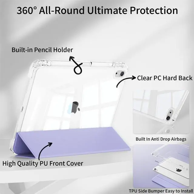 360 Protection: Premium leather hard back panel with flexible TPU bumper provides all-round protection for your iPad. Soft microfiber lining prevents your tablet from scratches. Crystal HD clear back fully displays iPad's color and logo