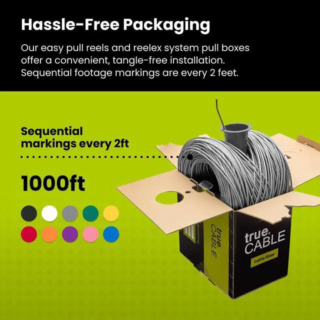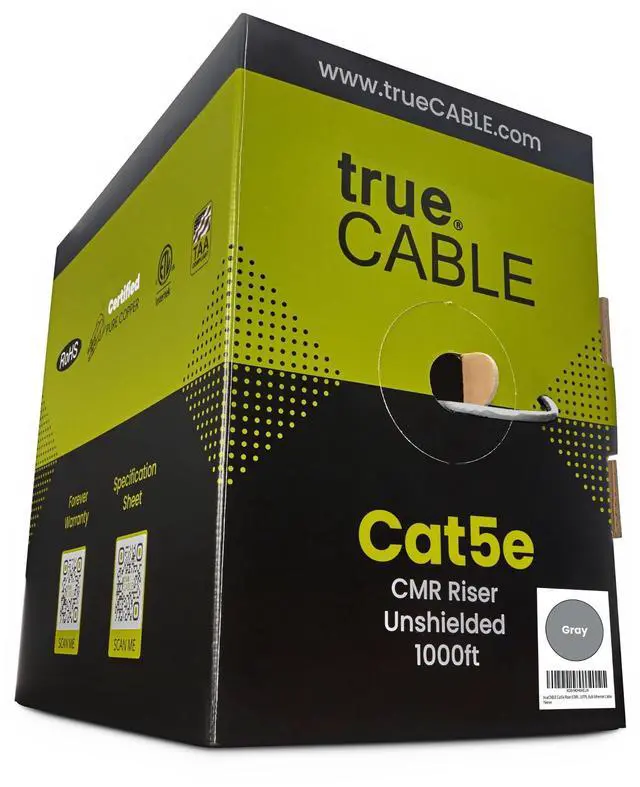 Supports Power over Ethernet: PoE/PoE+/PoE++ (IEEE 802.3 af/at/bt) 4PPoE up to 100W. ^^ [Hassle Free Packaging] 1000 feet (305 meters) comes conveniently pre-spooled in a tangle free, easy pull box so you dont have to worry about getting behind on your next job. ^^ [Solid Bare Copper Conductors] Pure bare copper conductors offer superior signal strength, conductivity, and flexibility compared to cheaper copper clad aluminum (CCA) options. Choose pure copper for a stronger, more reliable connection. ^^ [For Use Indoors] The gray riser rated jacket is for use in between floors, in wall, and non-plenum spaces. Help fires from spreading floor to floor in vertical installations with mild flame retardance. ^^ [ Certified by trueCABLE] Our data cables have been tested with a DSX-8000 Versiv CableAnalyzer and are in compliance with ANSI/TIA 568.2 -D standards, RoHS-3 compliant, and cETLus certified. Backed by our FOREVER WARRANTY. Compatibility & performance tested with trueCABLE RJ45 Connectors - B07XB3CPJK and B088KTYHMR