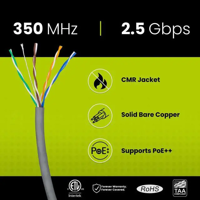 [High Performance Network Cable] This riser rated cat 5e cable is 24 AWG with 4 pairs (8 conductors). Suitable for 1 and 2.5 Gigabit ( 2.5GBASE -T) speeds up to 328 feet. Bandwidth tested up to 350 MHz.