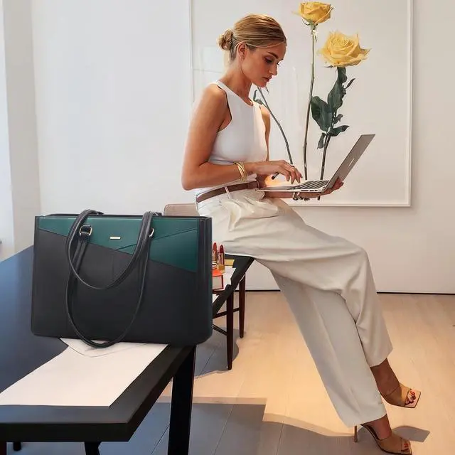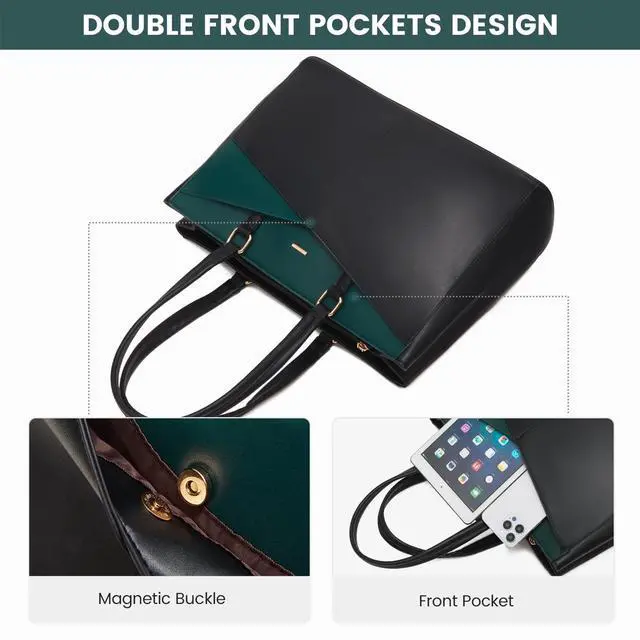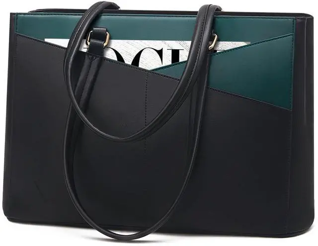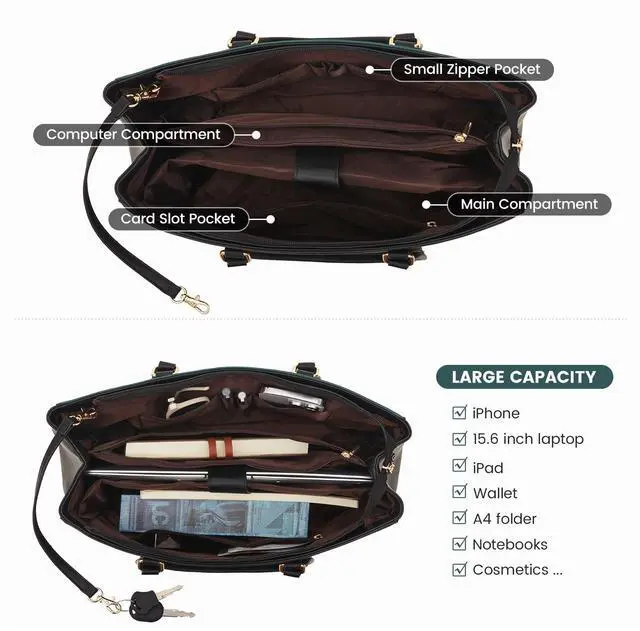 Material Laptop Bag: This computer tote is crafted in durable, water-resistant, scratch-resistant PU Leather and polyester lining. Top smooth metal zipper for easy opening. Metal feet base protects your bag from damage. ^^ Dimension & Chic Practical Tote Bag: Dimension of tote bag is 16.5" L * 5.5" W * 12" H;