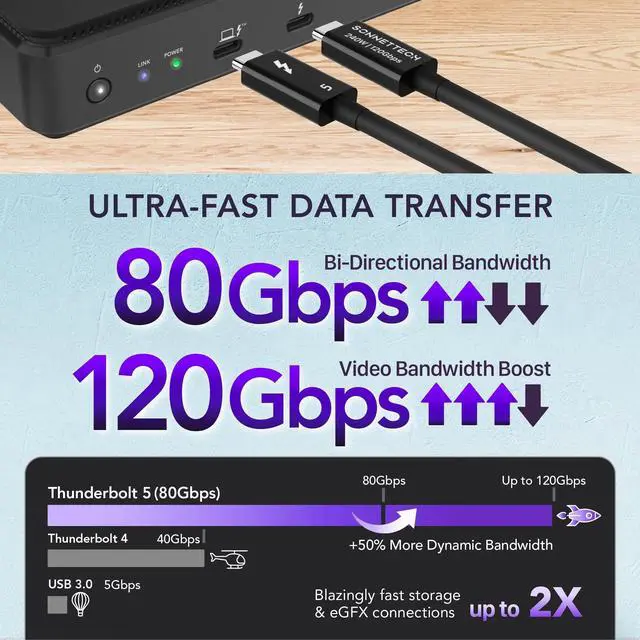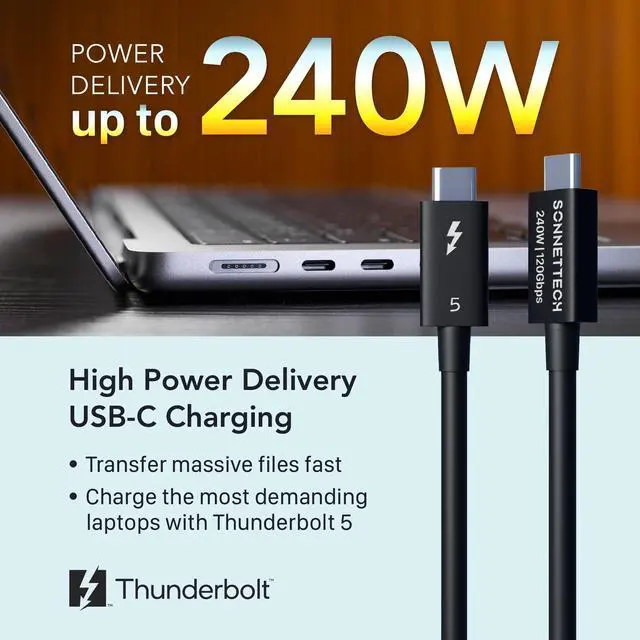 USB Power Delivery 3.1 enables charging up to 240W, making it a powerhouse for laptops, tablets, and other USB-C devicesperfect for simplifying your workspace with one ultra-capable cable. Compatible with Thunderbolt 3, Thunderbolt 4, USB4, and USB-C devices, it offers universal connectivity without compromise. Backed by Intel Thunderbolt certification, the Sonnet Thunderbolt 5 Cable is engineered for long-term durability, stable signal integrity, and professional-grade performance.