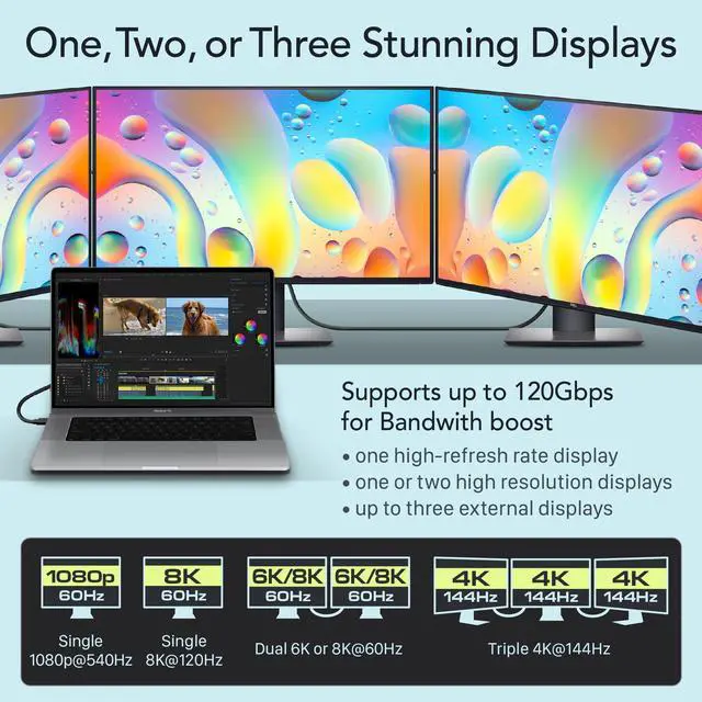 • Multi-Display 8K Support: Connect one 4K display at 540Hz, two 8K displays at 60Hz, or three 4K displays at 144Hz with a single cabledelivering crystal-clear visuals and ultra-smooth refresh rates. Perfect for video editors, 3D animators, and content creators, this Thunderb