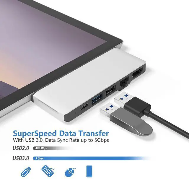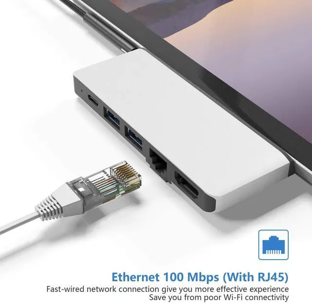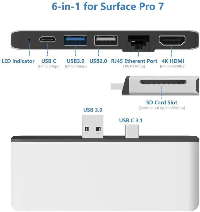 Surface Pro 7: Turns the USB-A connection and USB C into 6 ports (HDMI 4K/30Hz, 100M Ethernet LANUSB-C Port (Data Transfer), 2 x USB-A, SD