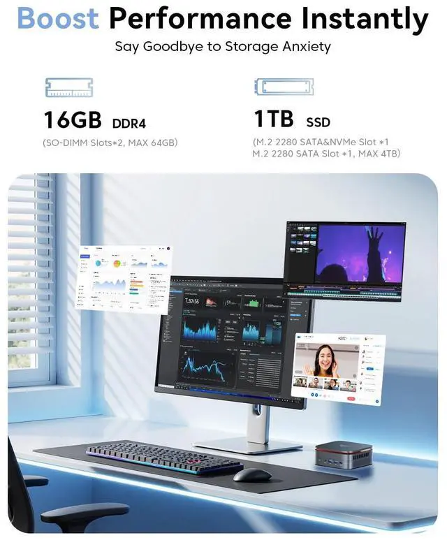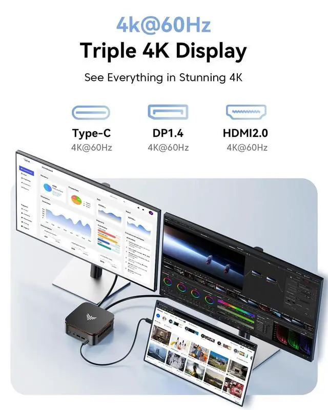 Compared to 8GB RAM, it offers up to 2 performance improvement, providing faster responsiveness and smoother multitasking. Built-in 1TB M. 2 SSD, enabling near-instant startup, quick app launches, and high-speed file transfers. For users with greater storage needs, it also supports expansion via an additional M. 2 SSD slot, with storage capacity scalable up to 4TB. ^^ Triple 4K Display Powered by AMD Radeon Graphics, supporting 4K@60Hz displays for stunning image quality and an immersive visual experience. It can connect to 3 display screens simultaneously1* HDMI + 1*DP 1.4 + 1*Type-C port) perfect for handling 4k movies, browsers or enjoying immersive entertainment.