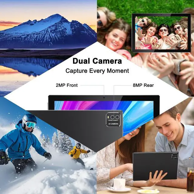^^ 10.1" HD Screen and HD lensThe stunning 10 IN eye protection full screen has a larger visual area and a wider visual field, adopts a 1280*800 IPS HD touch screen, whether you play games, watch movies, read, take notes and work, it can bring you immersive visual. The tablet 10 inch equipped with a 8MP rear camera with auto focus and flash, shooting is equally clear during the day and night, Capture Your Wonderful Moments. The 2MP front camera bring excellent clarity during video calls enjoyment ^^ Long Battery Life and Dual SpeakerAndroid tablets by a 6000mAh battery, durable battery life ensures long-term use, allowing you to study, work, and play all day without interruption.