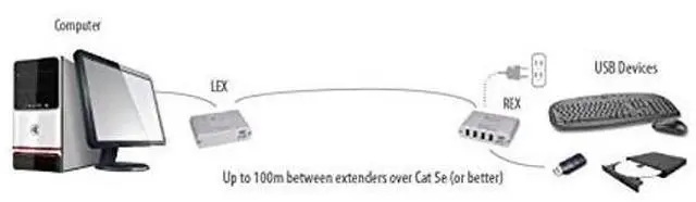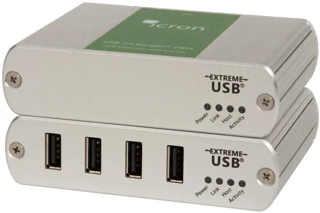 The four-port Icron Ranger 2304 provides true USB 2.0 extension at up to 480Mbps over Cat 5e cabling, without the need for supplementary software drivers. With thanks to ExtremeUSB, this true plug-and-play solution is compatible with all leading operating systems and supports all USB 3.0 (Please be aware that the Ranger 2304 supports USB 3.0 at speeds of USB 2.0 (480Mbps) ), 2.0 and 1.1 peripherals including Keyboards, webcams, mice, flash drives and interactive whiteboards across a dedicated Cat 5e connection. There is no need for an additional hub since Icron Ranger 2304 benefits from an integrated four port-hub which supports extension of up to four USB devices.