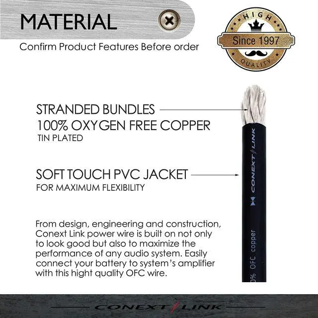 Stranded 100% tinned pure oxygen free copper, super flexible with PVC jacket ^^ Full 1/0 American Wire Gauge, 4753 strands of copper ( 0.12 mm) for conductor ^^ Come in one continuous length, also good for marine applications ^^ High resistance to heat, oil, chemicals and abrasion, low electric resistance ^^