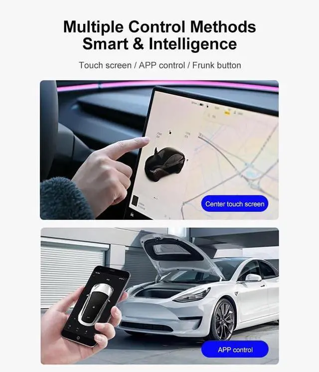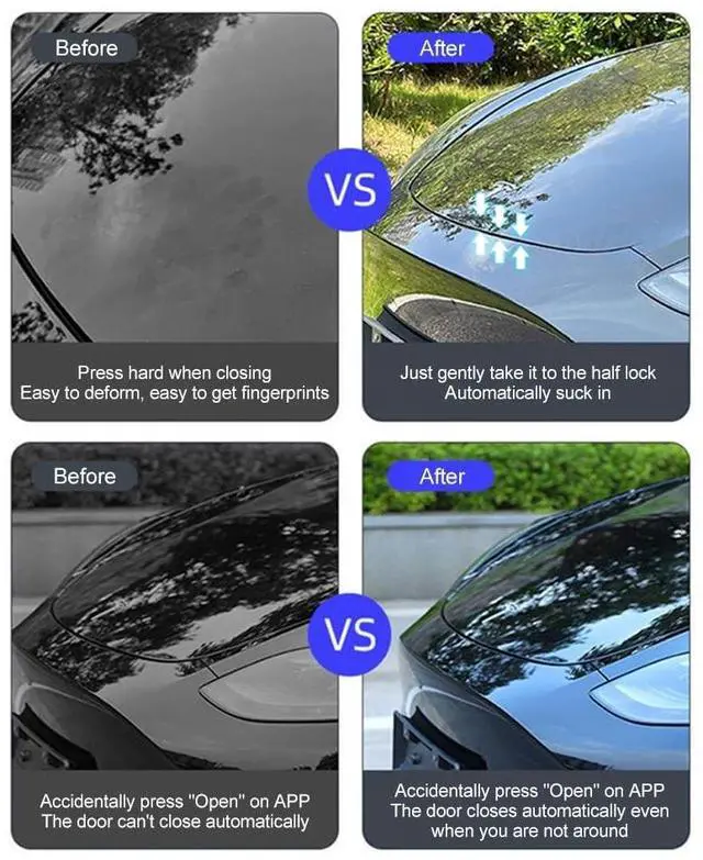 CompatibilityAuto Frunk Closer is specially designed for Tesla Model Y 2020-2024, with small size, large torque, convenient speed adjustment, strong controllability and durability. ^^ Hands-Free ConvenienceThe lock system is designed for user-friendly operation, and don't need pressing hard to close. Just push the frunk to the semi-closed state, and frunk will automatically close. ^^ Multiple Control ModesIt can be unlocked by the large screen in the center control, APP control, and the trunk buttons. When the front cover closes 5mm to the front, the front spare box automatically closes.