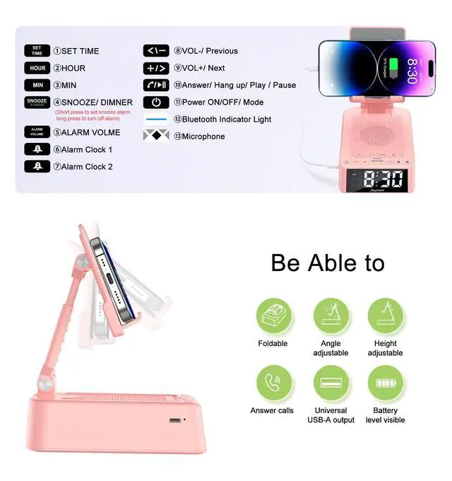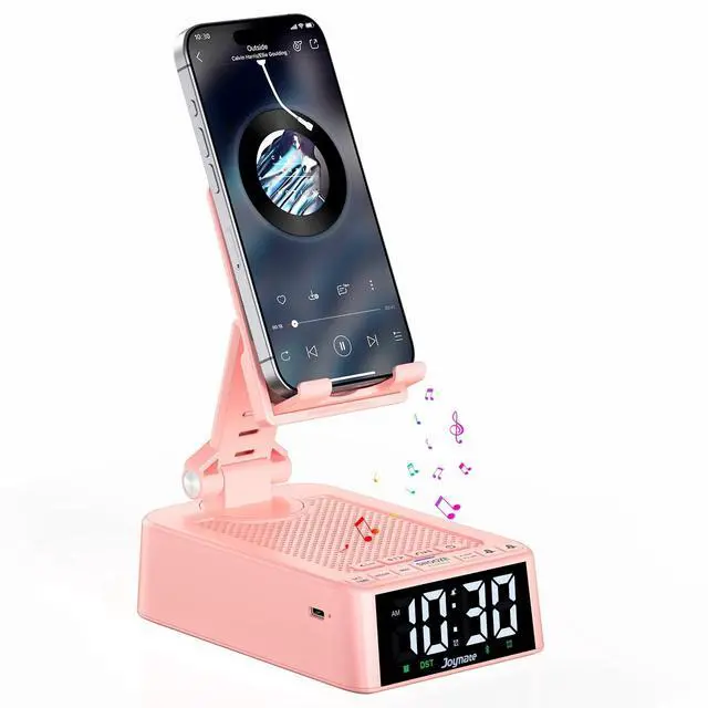 (Please note: it is not a charging stand. ) ^^ 2 Customizable Alarm Clocks with Snooze Mode- Whether it's waking up in the morning or setting reminders for important meetings, our phone holder with separate alarm clocks helps stay on top of your schedule. Short press the snooze button for a 5- minute snap, long press to close alarm. Providing convenience where it's needed most. ^^ LED Display with 3 Brightness and DST Formats- From a dim, calming glow at night to a bright, clear display during the day, it comes with flexibility to customize the screen brightness to your needs. Additionally, the time display is changable with 12/24/DST formats to suit your preferences and location. ^^ 360 Rotable & Angle/Height Adjustable- Allowing for flexible viewing angles, catering to diverse content preferences, such as video calls, multimedia entertainment, and taking showcase videos. Adjustable angle and height reduce eye fatigue and neck pain. A modern gift for Birthday, anniversary, and festival. ^^ [How to Turn Off Alarm Clock or Cancel Alarm Clock ]
