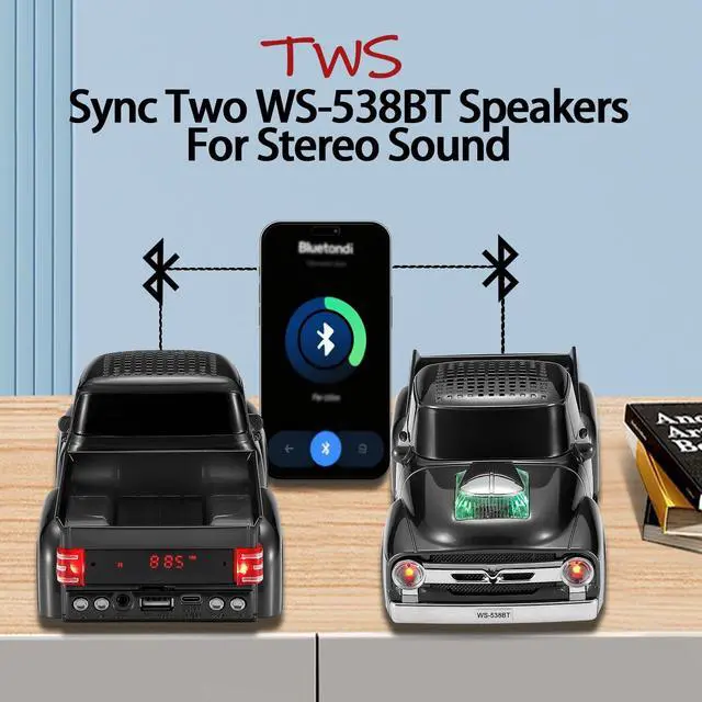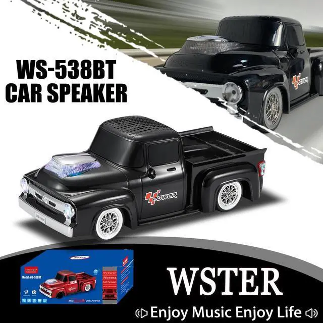 Retro Pickup Truck Design with Movable Wheels Styled after classic countryside pickups, the WS-538 functions as both a car model and a fully equipped speaker. A conversation starter for desktops and a hit among car Bluetooth speaker fans ^^ Bluetooth, TWS, and HD Sound Performance Enjoy crisp audio through Bluetooth streaming. Pair two speakers via TWS for stereo outputideal for indoor home audio speaker setups or outdoor party vibes ^^ Built-in Microphone for Hands-Free Calling Answer calls directly through the speaker with its built-in microphoneperfect for multitasking at your desk or taking calls during leisure time ^^ LED Party Lights + Multiple Playback Modes Light up the moment with dynamic LED party lights.