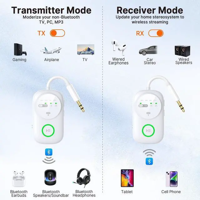 BLUETOOTH TRANSMITTER AND RECEIVER: In TX mode, Bluetooth transmitter connects non-Bluetooth audio sources such as airplanes, TV, or MP3 players to Bluetooth-enabled speakers, headphones via a 3.5 mm (AUX/RCA) cable. In RX mode, Bluetooth receiver receives audio from a smartphone or other Bluetooth source device and then transmits the audio to non-Bluetooth wired speakers, car, home stereos, headphones via a 3.5 mm AUX cable ^^