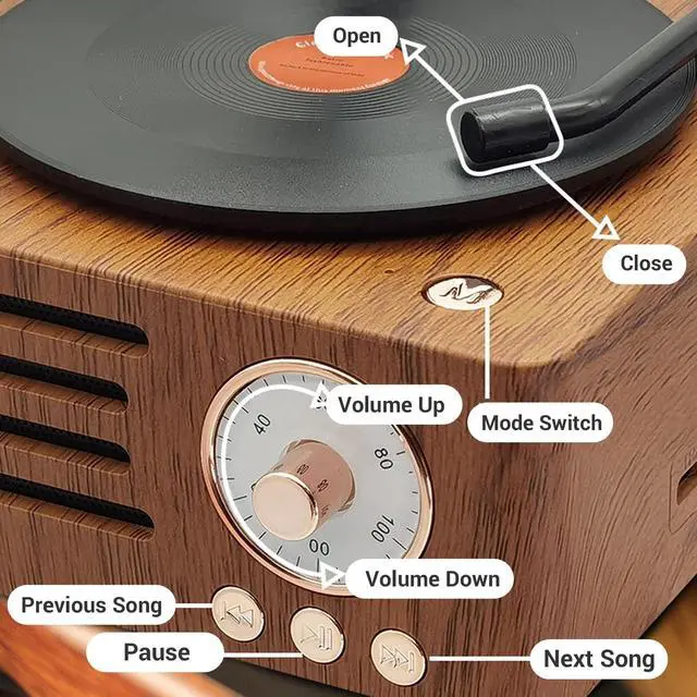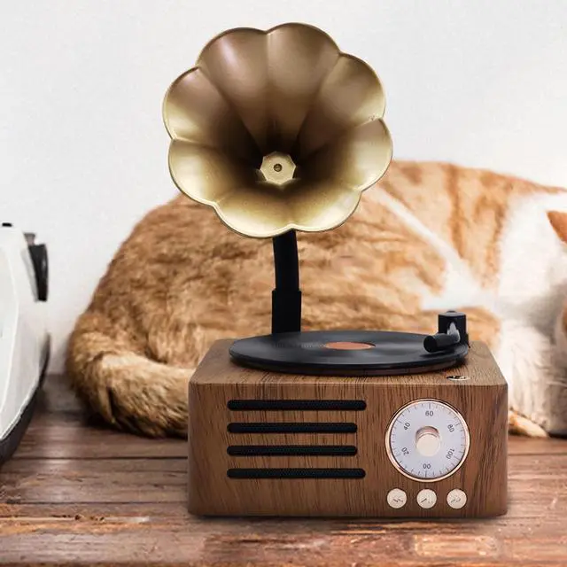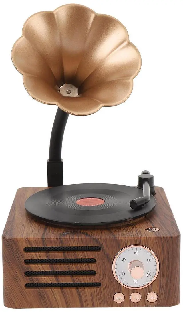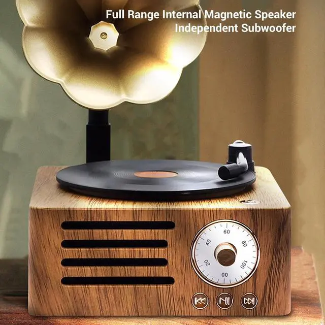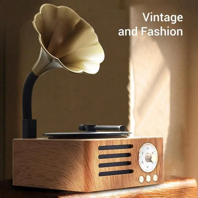Exquisite DesignThis portable Bluetooth speaker features a compact and elegant metal body, making it a beautiful decoration for your home. Its small size fits well in various places such as bedrooms or living rooms, adding a touch of sophistication to any space. Ideal for family and friends, this tiny music box serves as a meaningful that combines functionality and decorative charm. ^^ MultifunctionalThe record player stereo speaker not only offers Bluetooth and AUX line connectivity but also includes a radio function, allowing you to access real time news, sports updates, and music information conveniently.