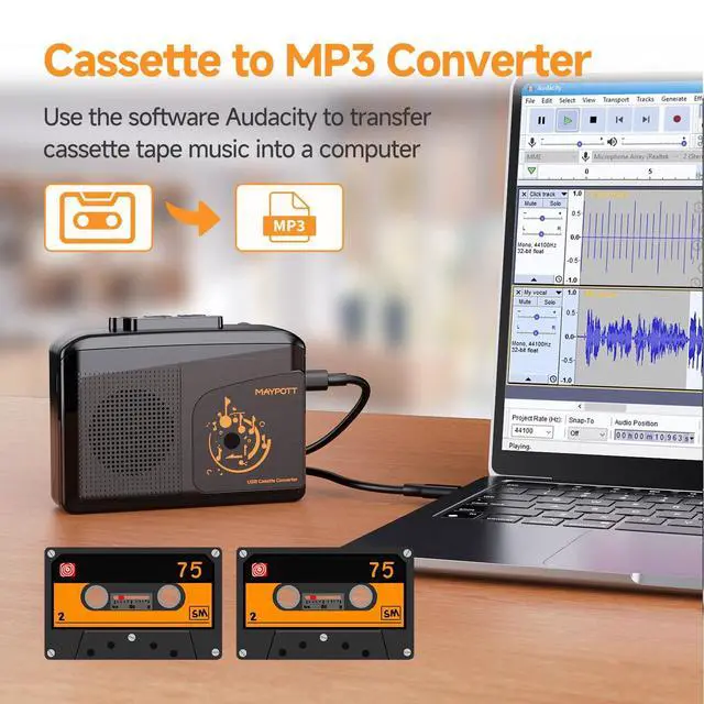 Portable Cassette Player & Cassette to MP3 Converter This is a multifunctional cassette player with play, forward, rewind, stop keys. Not only can it play your treasured tapes, In addition, This portable cassette player can easily convert tape music to MP3 music. Unlike other products, we use high-quality metal cassette player heads, making it smoother to play tapes and don't have to worry about damaging your cassette tape. ^^ Record and Converts Tape to MP3 This portable cassette player can easily convert tape music to MP3 music, Use the included USB C cable to connect the cassette player and the computer, use the software Audacity to transfer cassette tape music into a computer, Of course, you can also personalize the editing of recorded MP3 music on your computer, You can also use the AUX cable to record external audio to your computer.