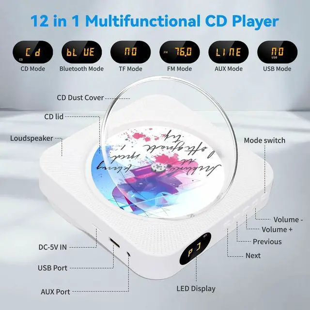Multifunctional CD PlayerThe CD player features CD, Bluetooth 5.1, USB, TF, AUX playback, 3.5 mm Aux & headphone jack, FM radio, timer, dust cover and remote control, etc. The portable CD players is widely compatible with CD, CD-R, CD-RW, MP3, WMA other five CD formats. This radio CD player is also equipped with a remote to conveniently control the player even if you are not nearby. This multifunctional music player not only retains the ceremonial feel of traditional CD playback, but can also be used in various environments such as gatherings, studios, massages, yoga, and home education.