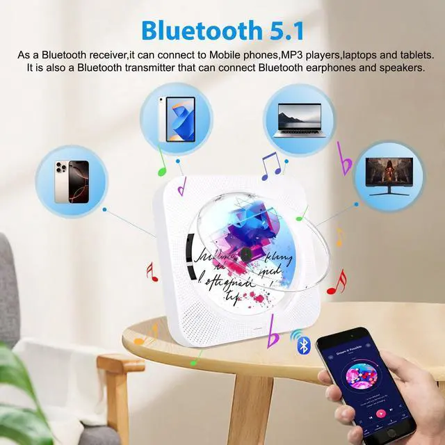 ^^ Bluetooth 5.1T his small CD player boombox is equipped with bluetooth 5.1 and has dual sending and receiving functions. As a fm transmitter bluetooth, the audio played from a CD can be converted to a bluetooth signal in real time and transmitted wirelessly to a bluetooth headset or speaker; As a receiver, The CD player bluetooth can receive audio signals from mobile devices such as mobile phones. The portable bluetooth CD player can not only listen to music with CD/USB/TF card, but also connect bluetooth signals from mobile phones and tablets to play wireless music as a speaker.