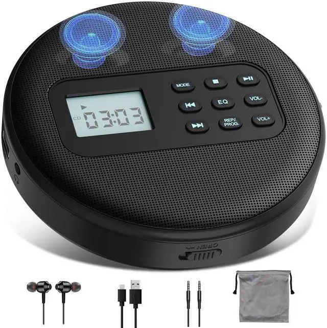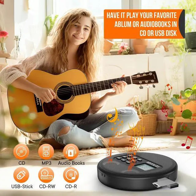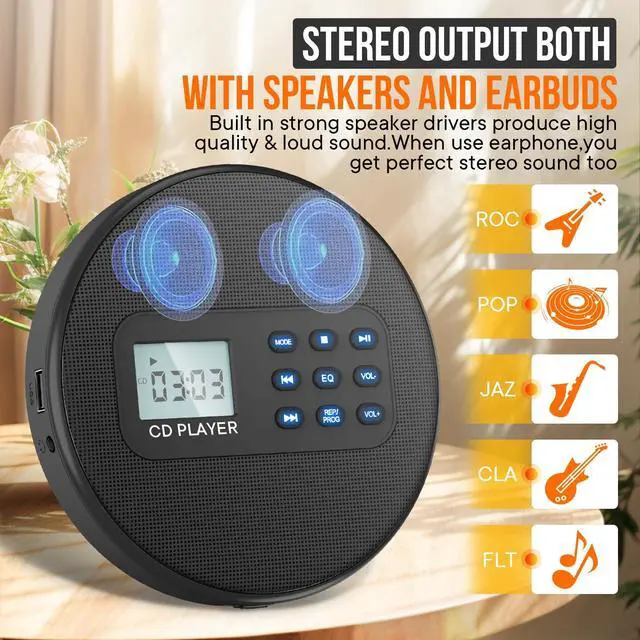 Switch this portable cd to different sound effect, we can feel them. It could be the ideal audiobook player or CD music player. ^^ Car CD Player with 3.5 mm Audio Cable ConnectionThis portable cd player for car with anti-skip protection plays uninterruptedly when use in car. Connect this cd player for car without CD player via audio cable, we hear sound from car speakers. So can we link to home stereo system. ^^ MP3 CD Player PortableThis discman plays CD, CD-R, MP3 discs and MP3 or WMA USB audios.