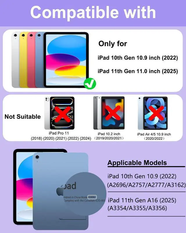 • Applicable ModelsThe keyboard case is only compatible with iPad 11th Generation 11 inch A16 2025 (Model:A3354/A3355/A3356) and iPad 10th Generation 10.9 inch 2022 (Model:A2696/A2757/A2777/A3162).Please check your iPad model before purchasing, this product cannot be used with other models. (Note: This product does not include : iPad and Stylus)