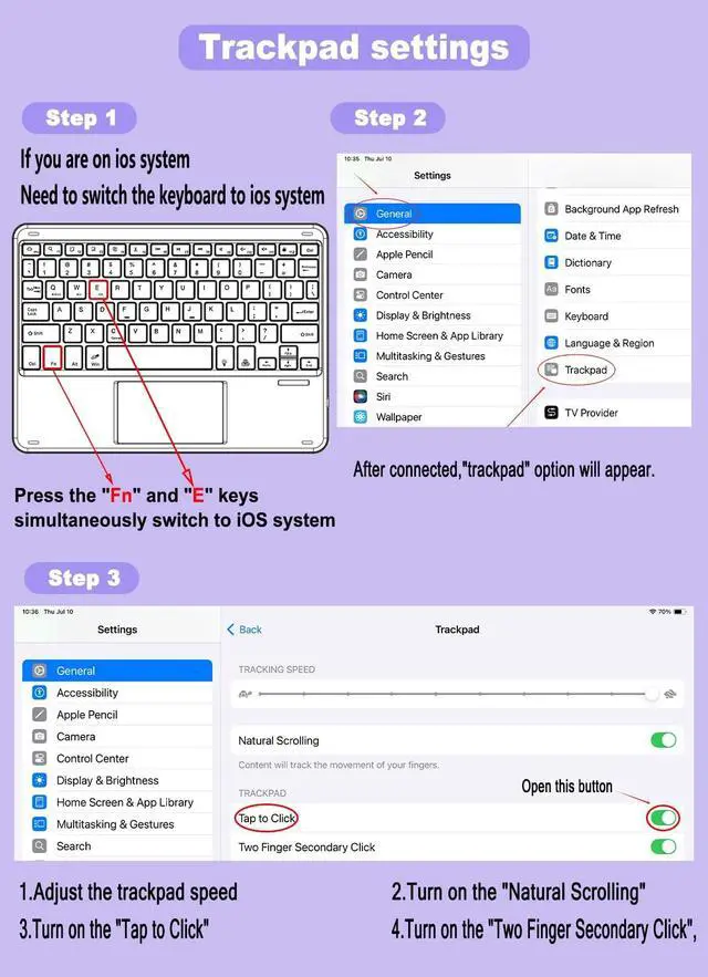 • Smart Touchpad, Supports Multi-touch The keyboard built-in smart touchpad, which has multi-touch function and supports 1 2 3 4 fingers Gestures . 1-fingers swipe can move the cursor, click to select the target, 2-fingers swipe can scroll the page and zoom the picture, 3-fingers swipe left and right can switch applications, and 4-fingers click can take a screenshot