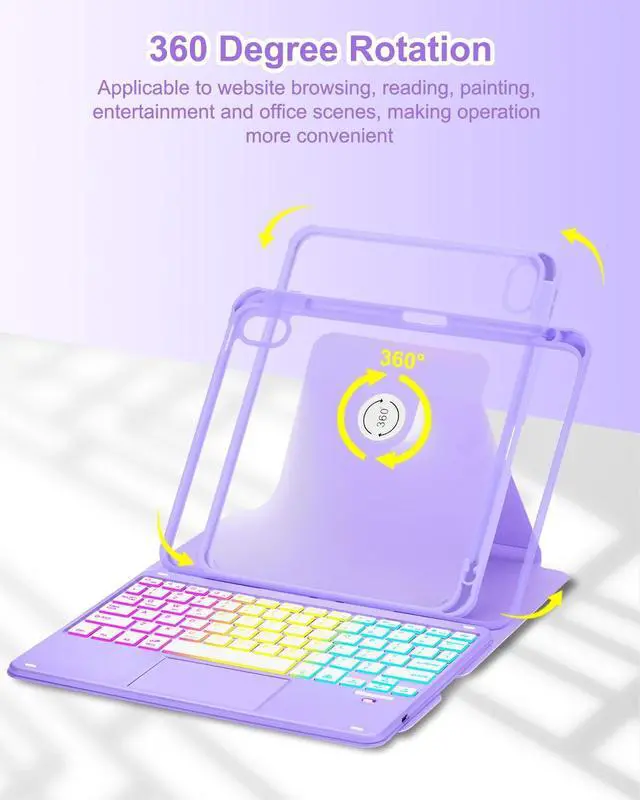 product does not include: iPad and Stylus) ^^ Smart Touchpad, Supports Multi-touch The keyboard built-in smart touchpad, which has multi-touch function and supports 1 2 3 4 fingers Gestures. 1-fingers swipe can move the cursor, click to select the target, 2-fingers swipe can scroll the page and zoom the picture, 3-fingers swipe left and right can switch applications, and 4-fingers click can take a screenshot ^^ 7 Color Rainbow Backlight, Multi-function Keys The keyboard have 7 color rainbow backlit, which can be switched between rainbow backlight mode and breathing light mode, providing you with a superior typing experience in dark environments. The first row of keyboard is equipped with shortcut function keys, which can quickly realize functions such as select all, copy, paste, pause/play, mute, volume adjustment, etc ^^ Rechargable, Detachable Keyboard This keyboard built-in 450 mAh battery, you can charge it 2-3 hours by USB-C charging cable, which can work for about 5 hours with the backlight on, and about 80 hours with the backlight off. The keyboard can be removable when you don't need it, which is convenient for you to carry your iPad with case ^^ 360-degree Rotation, Multi-angle Adjustable This keyboard case can rotate 360 degrees.