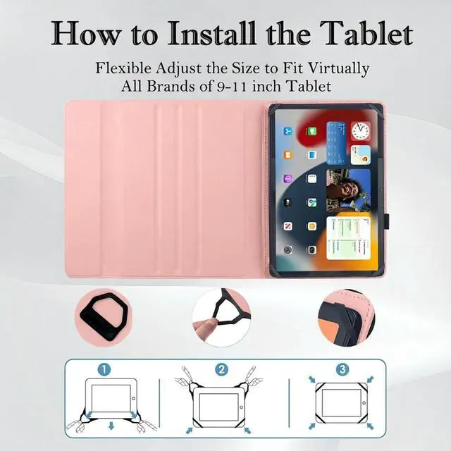 Wide CompatibilityUniversal slim case with keyboard designed to perfectly fit most 9-11 inch tablets such as Apple iPad 9.7 / 10.2 / 10.5 / 10.9 /11 inch, Samsung Galaxy Tab 9.7 / 10.4 / 10.5 inch tablet A8, S6, Compatible with iOS Version13+, Android and Windows tablets. Tablets must be 6.2 - 7.08" wide (160-180 mm) & 9.05 - 10.2" long (230-260 mm). ^^ Magnetic Detachable KeyboardThe keyboard for tablet securely attaches to the protective case using a strong magnetic strip. You can detach and store the keyboard separately, leaving the case.