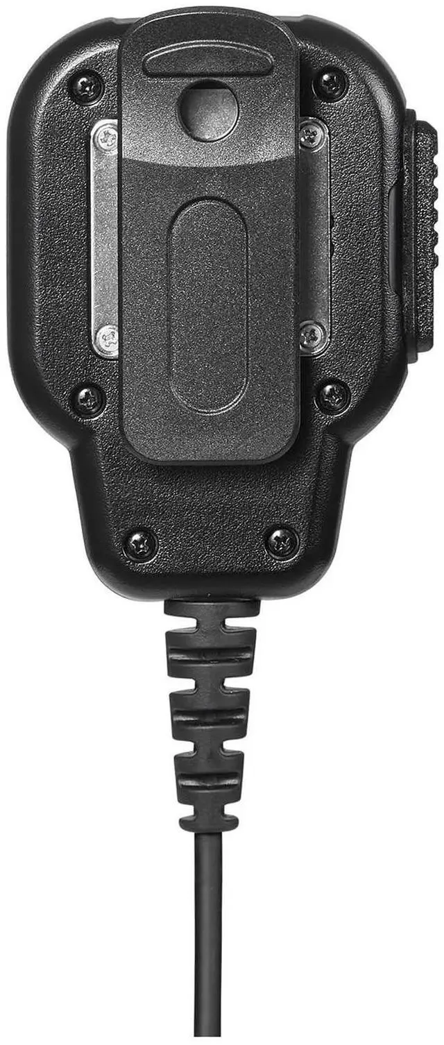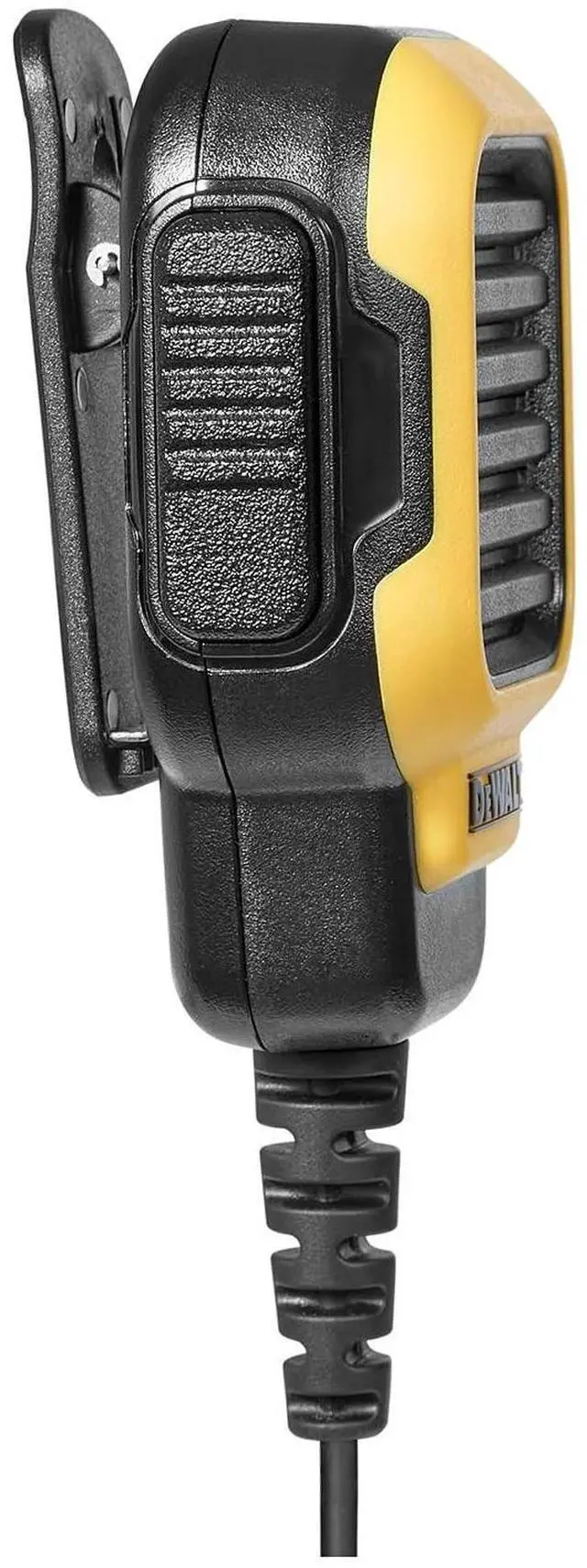 The DEWALT DXFRSRM1 remote speaker microphone extends the communication capability of DXFRS300 and DXFRS800 FRS two-way radios with convenient clip-on hands-free operation. The push-to-talk button enables instant one-touch transmission so users can communicate without reaching for the radio. A three-hundred-sixty-degree swivel clip secures the microphone to any shirt collar, jacket lapel, or vest strap, keeping it accessible during hands-on work. The built-in speaker delivers clear, loud audio output for use in moderately noisy environments such as warehouses, construction sites, and event spaces. Connecting via a two-point-five millimeter audio jack, the accessory is simple to attach and remove without tools.