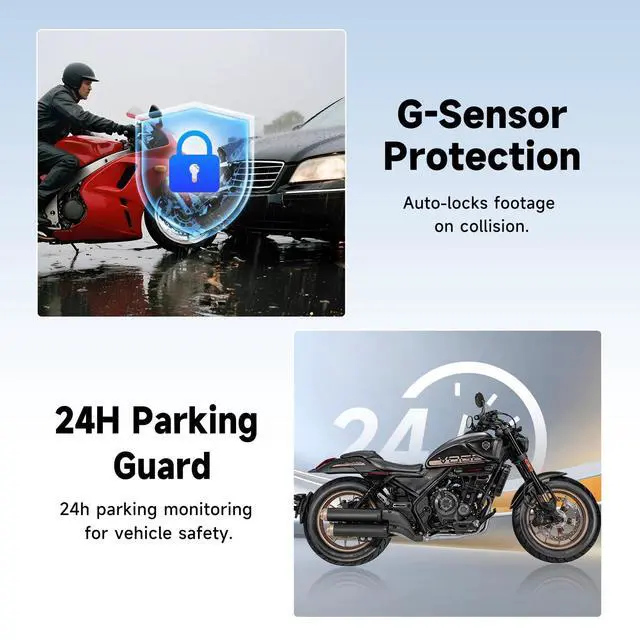 LOOP RECORDING & EMERGENCY LOCK: Supports up to 128GB microSD cards (not included) with auto-overwrite loop recording for non-stop use without manual deletion. Equipped with parking monitoring to guard your motorcycle while parked. Built-in G-sensor (adjustable sensitivity, enabled via app) detects collisions/vibrations, automatically locking 10-15s critical footage to prevent overwritingproviding objective evidence for accidents, theft or vandalism. ^^ ALL-WEATHER DURABILITY IP67 waterproof and dustproof rating, this motorcycle dash cam withstands harsh weather conditionstorrential rain, heavy fog, dusty mountain roads, or extreme temperatures. It reliably records every wonderful or critical moment during your ride, no matter the environment. ^^ 12-MONTH QUALITY GUARANTEE, 24/7 CUSTOMER SUPPORT. For technical support, reach out anytime were happy to help! Well respond within 24 hours with a solution.