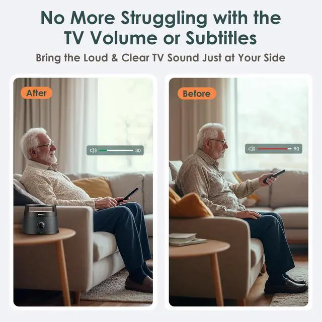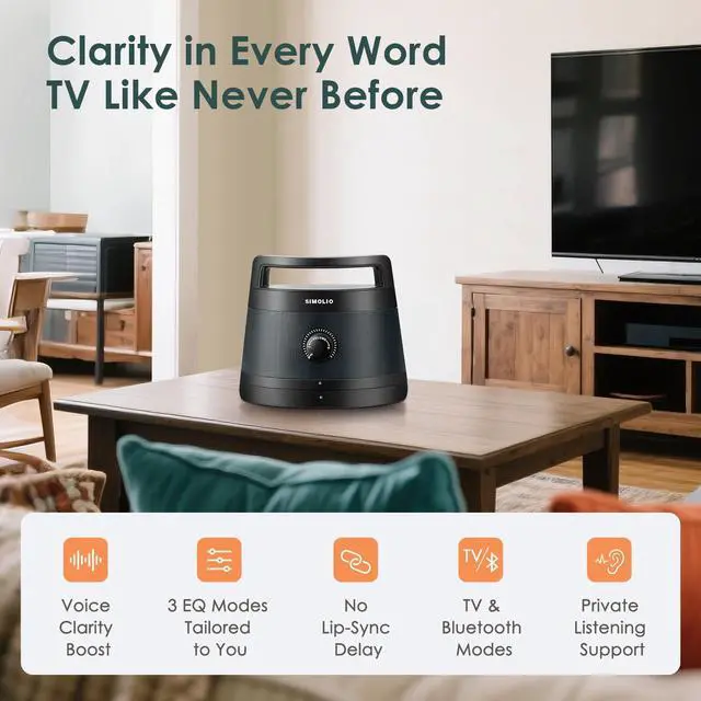 Wireless TV Speakers for Seniors & Hard of Hearing - Co-designed with audiologists, these portable speakers boost voice clarity and minimize background noise, ensuring you never miss a word. Powered by dual speakers, they deliver crisp, rich sound at any volume. Easily switch between 3 preset EQ modes - Dialogue, Standard, and 7.1CH Surround Sound for personalized, immersive listening. ^^ Personal Listening, Anywhere at Home Unlike traditional soundbars that stay fixed under the TV and project sound across the entire room, this TV wireless speaker brings audio directly to you.