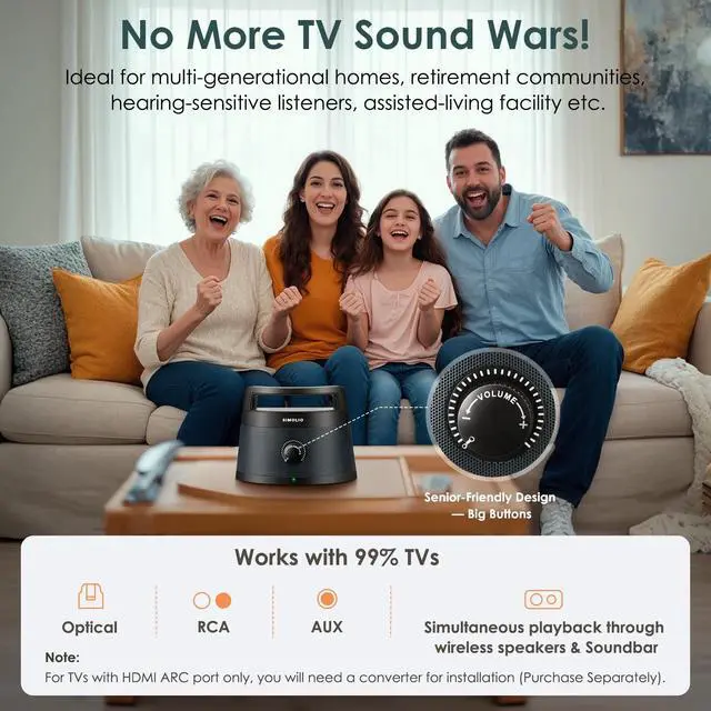 Note: HDMI ARC TV connection requires a converter (purchase separately). ^^ Quiet Listening Solution - Includes wired headphones for private viewing (plug into speaker's 3.5 mm jack). Combines with By-Pass feature to sync with existing soundbars/Home theaters - Ideal for couples wanting simultaneous speaker use. ^^ Multi-Room Harmony - Use 2+ wireless TV assisted listening systems simultaneously (e. g., living room + bedroom TVs) with zero crosstalk. Ideal for apartment buildings or family zones.