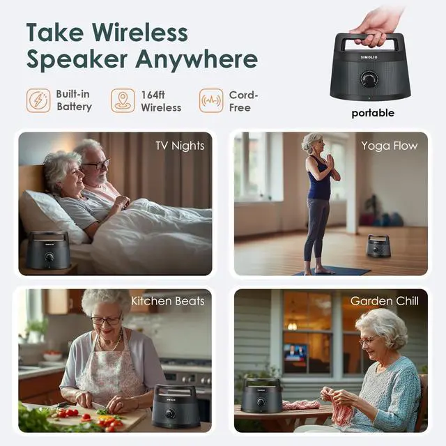Simply place it next to you, adjust the volume to your comfort level, and enjoy clearer dialogue without disturbing the rest of the household. ^^ Zero-Lag TV Mode & Bluetooth Connectivity - Experience perfect audio sync with your TV using the 2.4GH z wireless TV mode. Easily switch to Bluetooth mode to stream music and podcasts from your devices. Seamless switching makes this speaker perfect for everything from late-night movies to outdoor gatherings. ^^ 164FT Ultra Range & Flexible Power System - Stream clear, stable sound up to 164ft with no dropouts, perfect for room-to-room or outdoor listening.