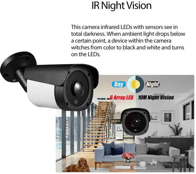 264, H. 265 only needs half the bandwidth to transmit the same image quality, can Save you more unnecessary storage space. ^^ IP65 Waterproof, Night Vision The camera is IP65 waterproof, built-in 6 infrared LEDs, provides 170 viewing angle and 10-15M infrared night vision, can work in various weather conditions, suitable for outdoor and indoor monitoring. ^^ Wide range of applications No matter where you are, you can remotely view and play surveillance images when you need them. Because this camera has an APP for mobile clients (iOS, Android) and VMS software for Windows computers (not for MAC OS and Linux).