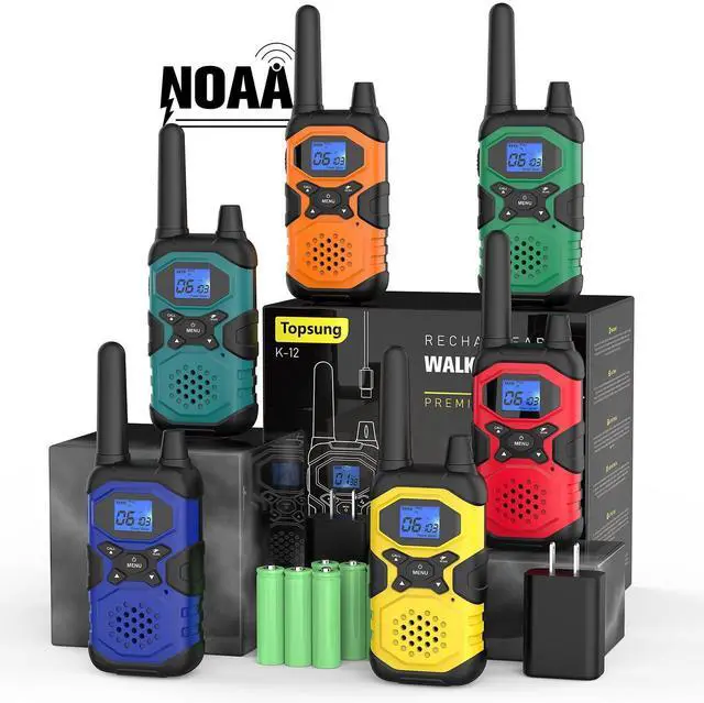 Our IVOX hands-free feature ensures your communication is always smooth and enjoyable, especially when multitasking. With IVOX feature, whether you're climbing, setting up camp or navigating trails, your walky talky experience is always a step above the rest ^^ Always Prepared With NOAA AlertsStay a step ahead of nature with Topsung NOAA walkie-talkies, even when there's no cell service in remote areas. With our integrated National Weather Service, stay updated on all hazard weather channels. Act faster with alerts, granting you the vital moments needed to ensure your family's safety during unpredictable weather conditions ^^ Complete Accessories, All In One GoThis collection includes robust walkie talkies designed for team & family, original USB charger for safe & fast charging, micro USB Y cable for simultaneous charging, high-capacity 4500mAh battery for extended communication time, belt clip and adjustable lanyards for ease of carry.